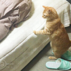 ダンボール爪とぎハウスを組み立てる猫